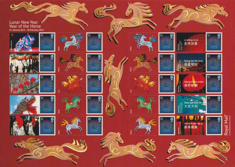 2014 Year of the Horse special large self adhesive m/s containing 20 x 2006 SG 2676 ("Firework" art) & 20 greetings labels.