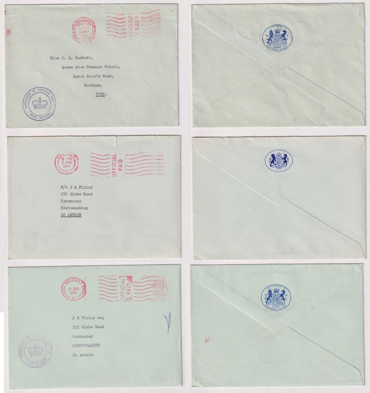Northern Ireland 1965-74 matching official covers x 3, all with royal arms device on flap (incl 2 "Government of Northern