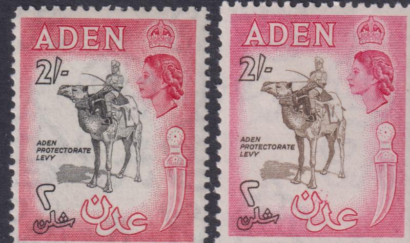 Aden 1953 2/- Camel x the 2 shades, sepia & black. SG 65-6. Cat £17. MUH.