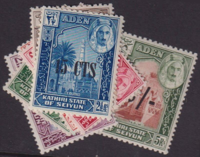 Aden-Kathiri State of Seiyun 1951 5c-5s new currency ovpts on 1942 Pictorials, set of 8. SG 20-27. Cat £50. LH Mint.