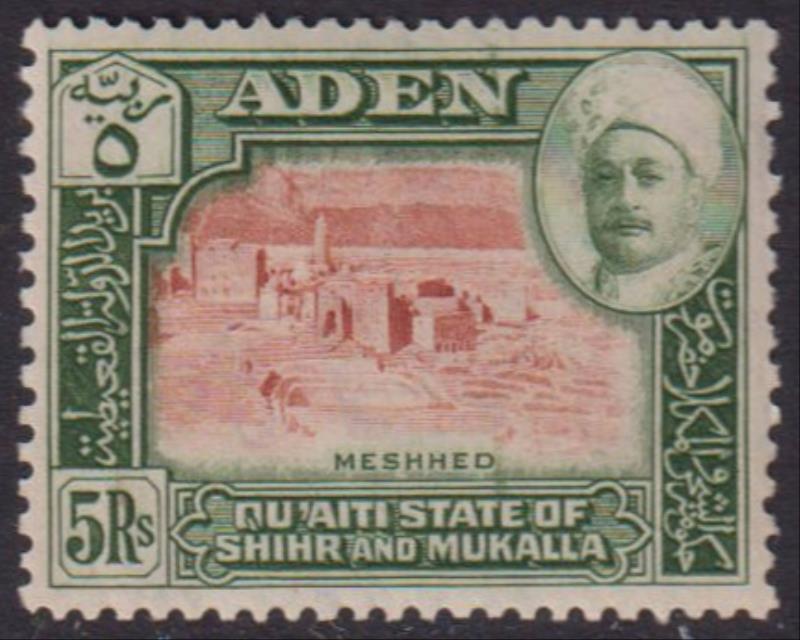 Aden-Qu'aiti State 1942 5R Meshhed Town brown & green, top value. SG 11. Cat £40. Mint. (Image)