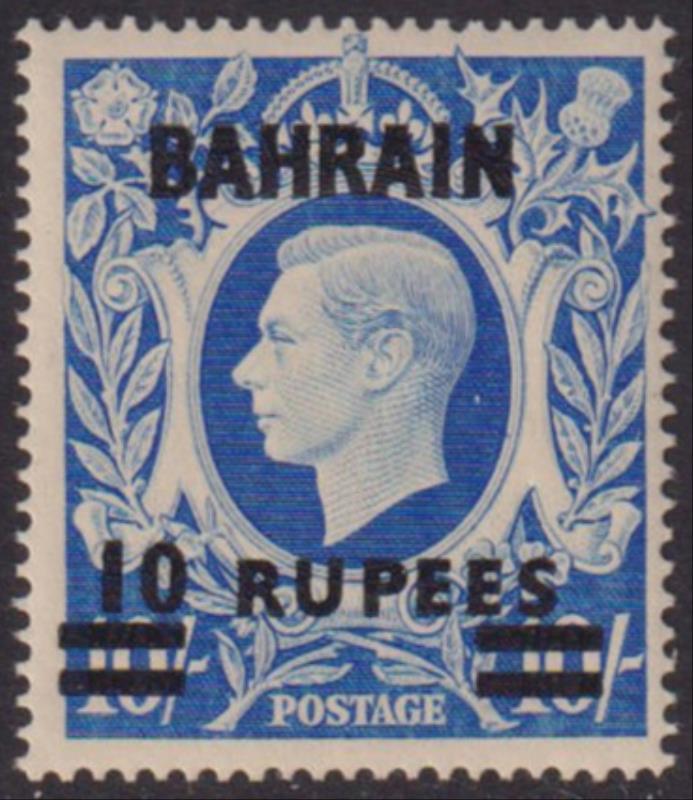 3302 M imageBahrain 1949 10R ovpt on GB 10/- GVI Arms ultramarine, top value. SG 60a. Cat £95. Mint. (Image)