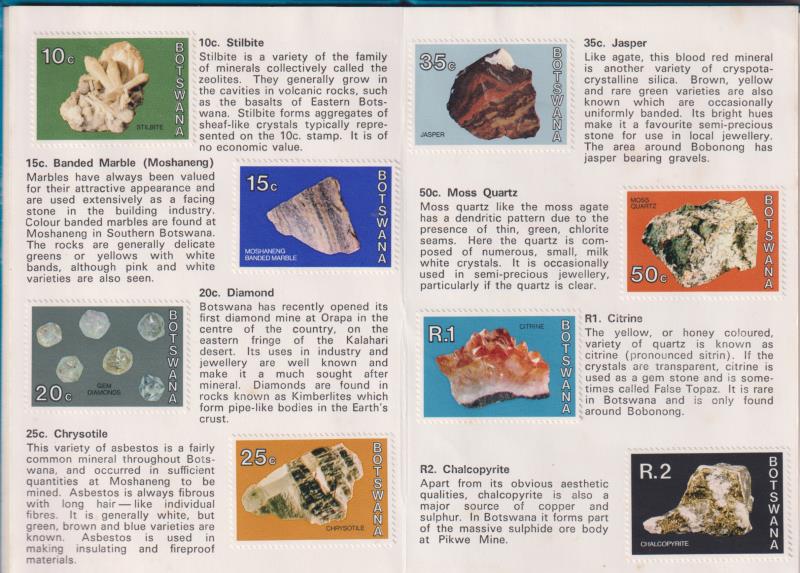 3335 M imageBotswana 1974 1c-R2 Minerals defin set of 14 in complimentary small folder (hard cover, with national arms, concertina-style pages), presented to delegates at 17th UPU Congress (c1975). Each stamp stuck down. SG 322-35. Cat £53. (Image)