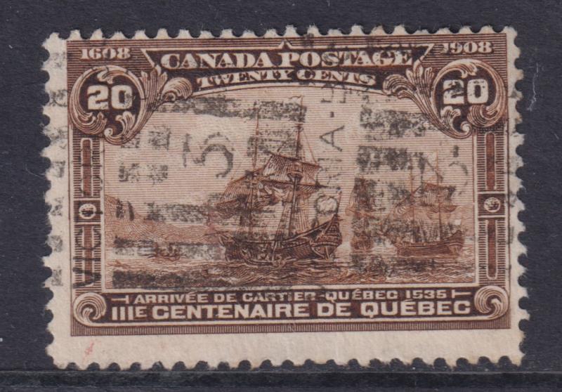 Canada 1908 20c Quebec, o/c. Top Value. Roller cancel. SG 195. Cat £150. GU. (Image)