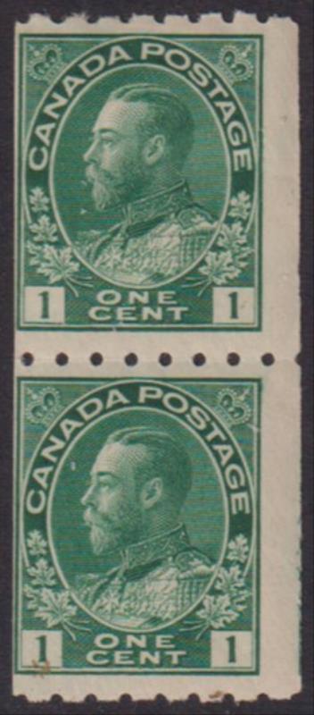 Canada 1912 1c blue-green coil, p12 x imperf vert pair, lower stamp MUH, upper mint & thin, this not counted in cv. SG 217.