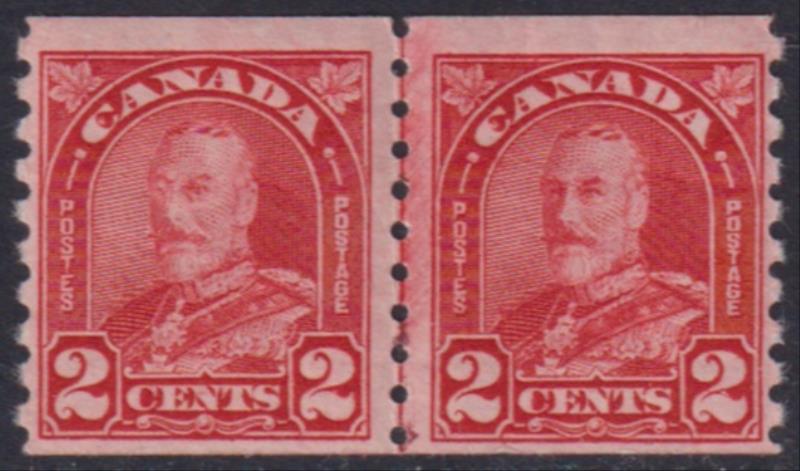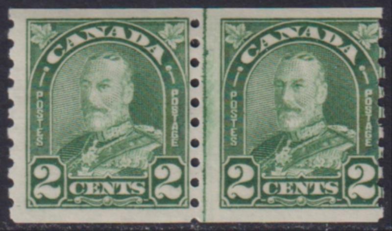 Canada 1930 2c GV green joint line coil pair, imperf x p8½. Scott cat US$17.50. Mint. (Image)