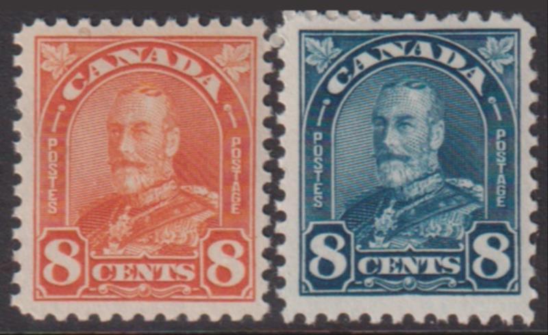 Canada 1930 8c GV blue & orange. SG 297, 298. Cat £26. Both MUH. (Image)