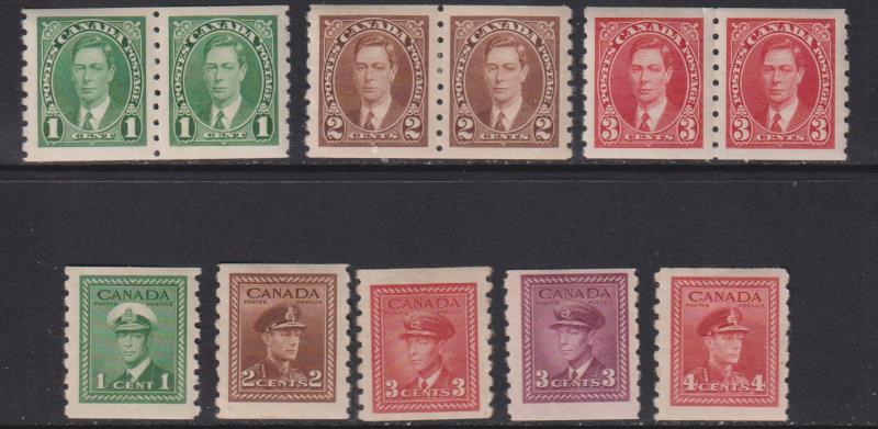 Canada 1937 1c, 2c & 3c GVI horiz pairs, imperf x p8, coils, mint (1c MUH) & also 1942-3 1c-4c imperf x p8 coils (5v) mint.