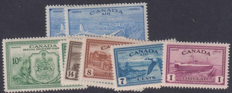 Canada 1946 Peace Re-conversion set of 7 & Special Delivery x 3 (incl both accents of 17c). SG 401-7, S15-17. Cat £79.