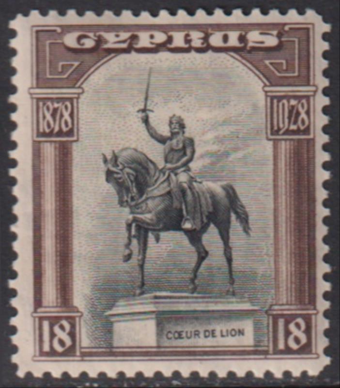 Cyprus 1928 18pi 50th Anniv of British Rule, black & brown (Richard the Lionheart statue). SG 130. Cat £30. Mint. (Image)