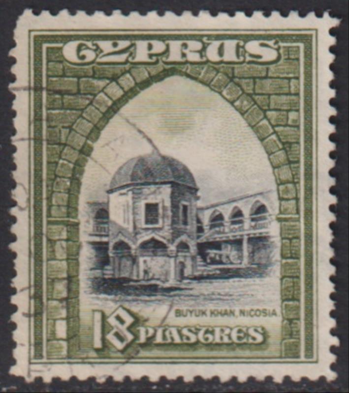 Cyprus 1934 18pi Buyuj Khan, Nicosia (black & olive-green), a few short perfs. SG 142. Cat £55. FU. (Image)