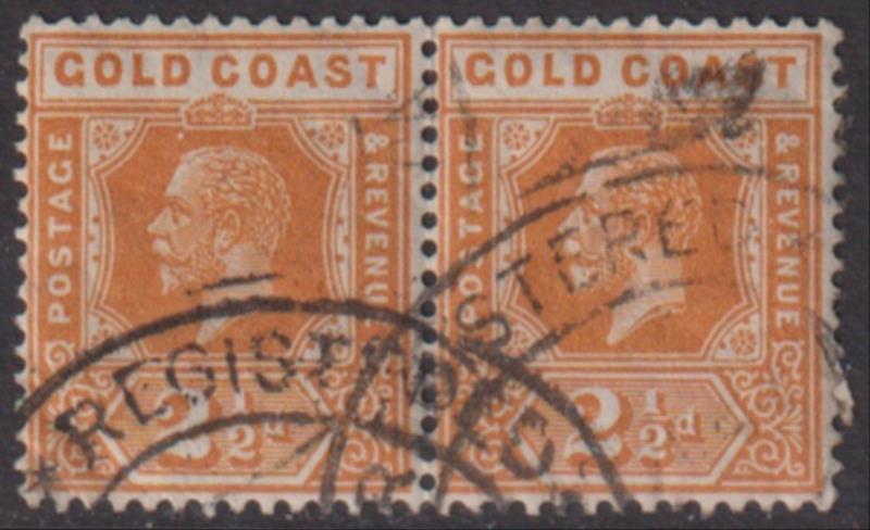 3605 U imageGold Coast 1922 2½d GV yellow-orange horiz pair, part reg'd cds. SG 90. Cat £36. FU. (Image)