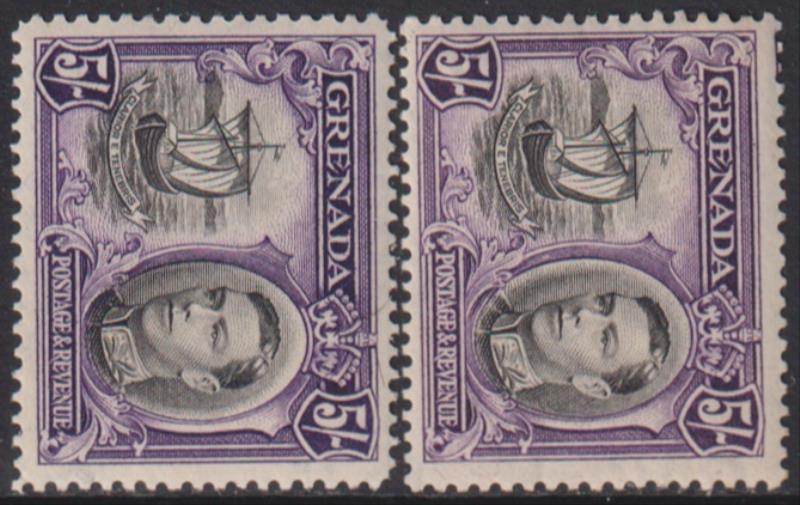 3619 * imageGrenada 1938-47 5/- GVI & Badge x 2: p12½, p13½ x 12½. SG 162/a. Cat £24. MUH. (Image)