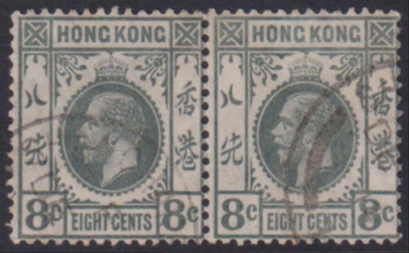 3628 U imageHong Kong 1912 8c GV grey horiz pair, mult crown CA wmk. SG 104. Cat £24. FU. (Image)