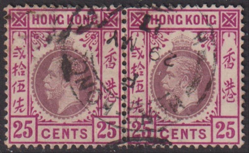 3629 U imageHong Kong 1914 25c GV horiz pair (type A), 29 May 1917 cds. SG 108. Cat £96. FU. (Image)