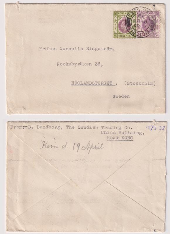 3633 C imageHong Kong 1938 cover to Stockholm, Sweden bearing 5c & 20v GV. (Image)