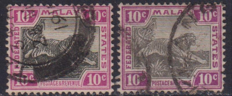 3732 U imageMalaya-Federated States 1904 10c Tiger, both shades. SG 43, 43b. Cat £16+. GU/FU. (Image)