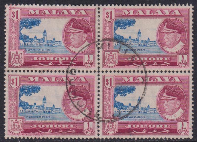 3736 U imageMalaya-Johore 1960 $1 block of 4. SG 163. Cat £34. VFU. (Image)