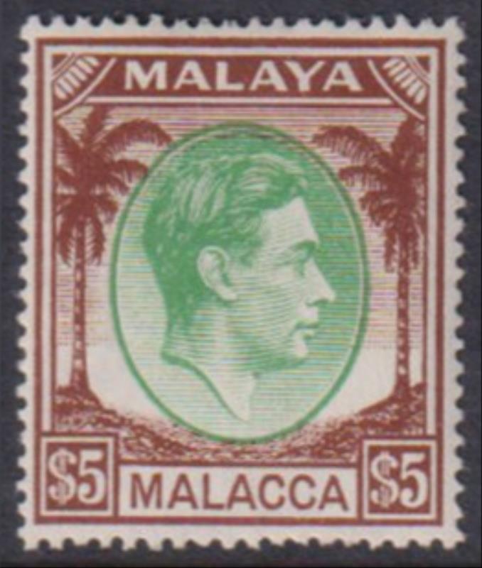 3739 M imageMalaya-Malacca 1949 $5 GVI green & brown. Top value. SG 17. Cat £65. Mint. (Image)