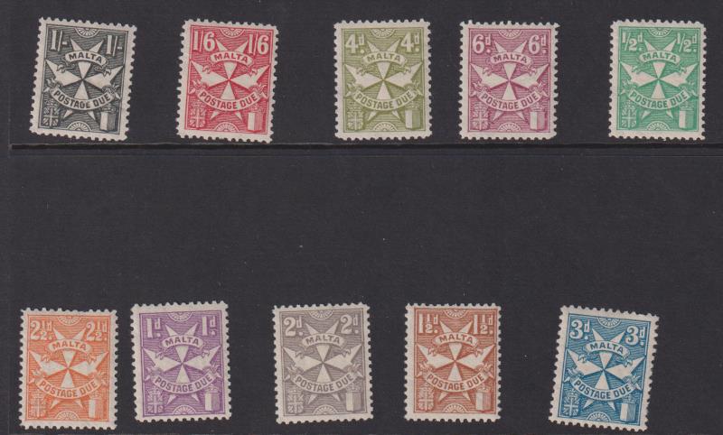 Malta 1925 Postage Dues: ½d x 7; 1d x 7; 1½d x 5; 2d x 3; 2½d x 4; 3d x 4; 4d x 5; 6d x 2 & 1/- x 2 (39v). SG cat £180+. mostly mint, odd one MNG.