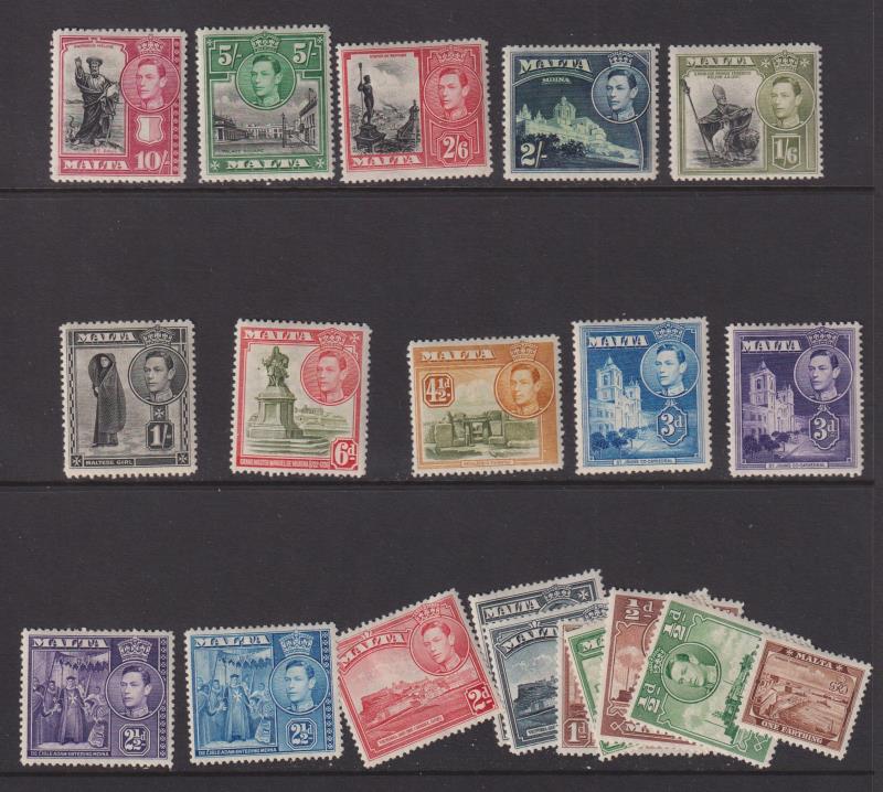 Malta 1938 GVI set (no 1½d red or 5/-). SG 217 etc. Cat £65. Mint. (Image)