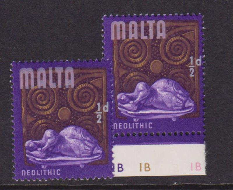 Malta 1964 ½d Neolithic Era error: rose-pink colour doubled, with normal for comparison. SG 330, 330b. Cat £10+. MUH. (Image)
