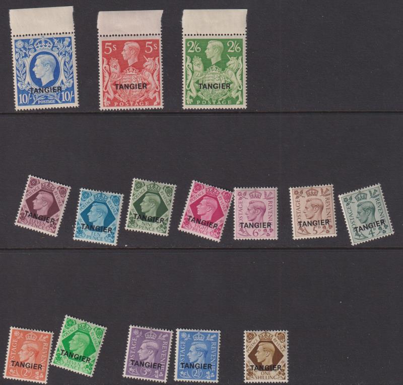 3808 M* imageMorocco Agencies-Tangier 1949 GVI set, 2/6d, 5/- & 10/- hinged on selvedges, otherwise MUH. SG 261-75. Cat £120. Mint/MUH. (Image)