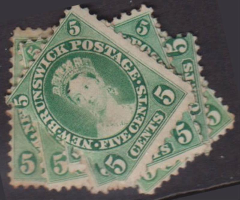 3817 M imageNew Brunswick 1860 5c QV green group of 6, with shades & variable condition. SG 14 etc. Cat £174. Mint/MNG. (Image)