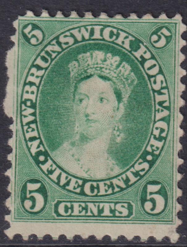 3818 M imageNew Brunswick 1860 5c deep green. Several blunt perfs (incl extra paper) on LS - unusual. SG 15. Cat £21. Unused no gum. (Image)