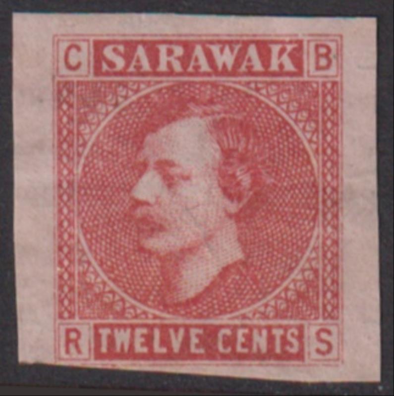 Sarawak 1875 12c Sir Charles Brooke imperf proof (3½ margins) in issued colour (red on pale rose). Small faults visible on