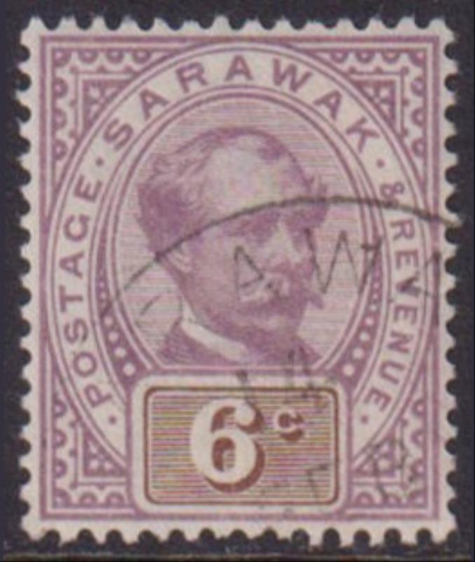 Sarawak 1888 6c Sir Charles Brooke "Postage & Revenue", purple & brown, light ink marks on back. SG 13. Cat £65. FU. (Image)