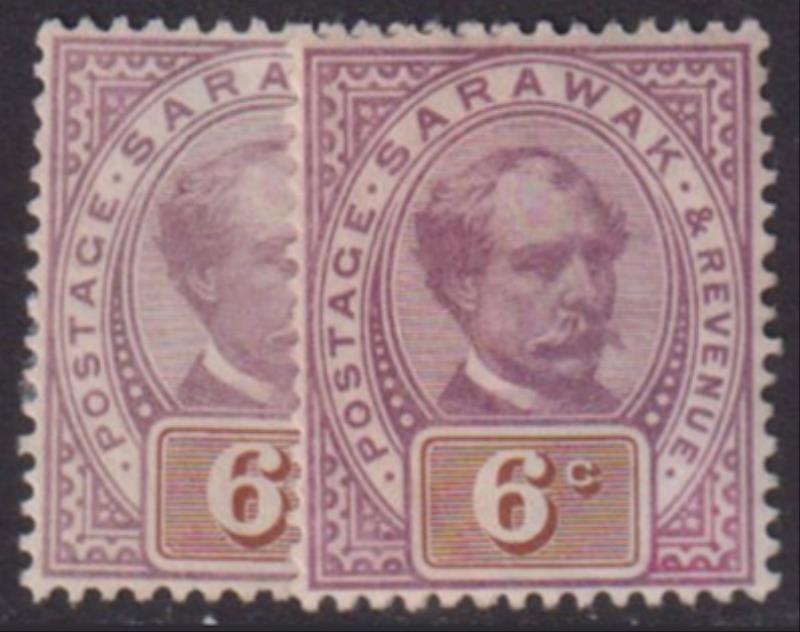 Sarawak 1888 6c Sir Charles Brooke "Postage & Revenue", purple & brown, two distinct shade variants. SG 13. Cat £64. Unused