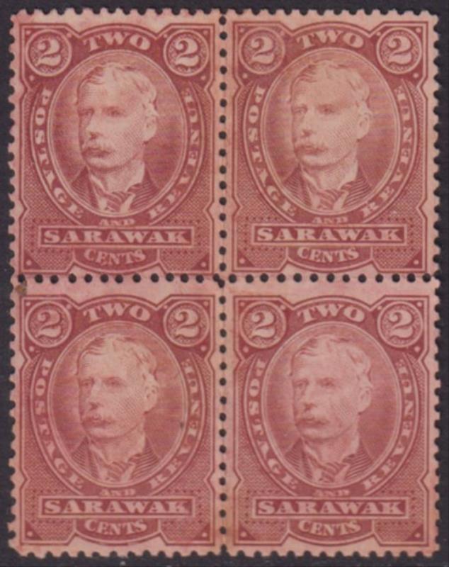 Sarawak 1895 2c Sir Charles Brooke block of 4 (2nd portrait) brown-red, p12½. Stamp ink colour appears suffused through