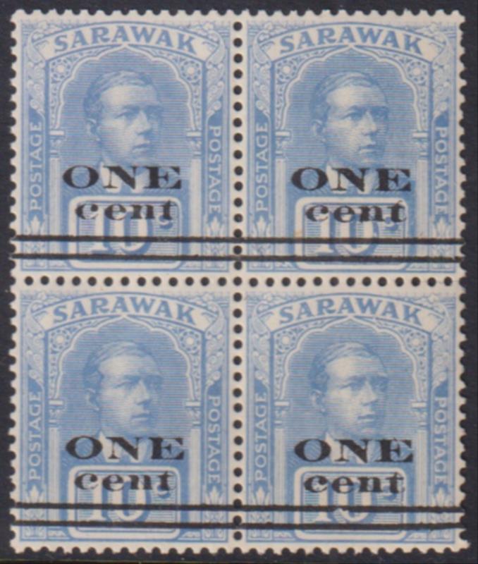 Sarawak 1923 1c on 12c dull blue block of 4, lines of ovpt 1¼mm apart. SG 72. Cat £32+. MUH. (Image)