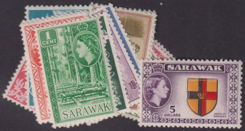 Sarawak 1955-7 1c-$5 QEII 1st Picts set of 15. SG 188-202. Cat £100. MUH or (mostly) VLH mint. (Image)