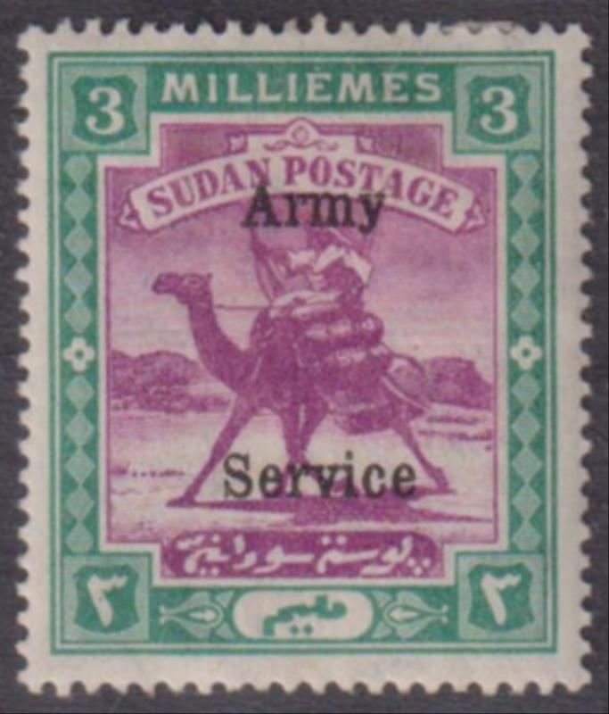 Sudan 1906 3m Camel Postman, "Army Service" official. SG A8. Cat £26. Mint. (Image)