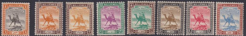 Sudan 1902-21 1m-10P Camel Postman, multiple crescent & star wmk, simplified set of 11, mint. 5P is later chalk-surfaced paper (gum adhesions), 10P gum creases. Also 1903 5m on 5P mint. SG 18-26, 27a, 28, 29. Cat £146.
