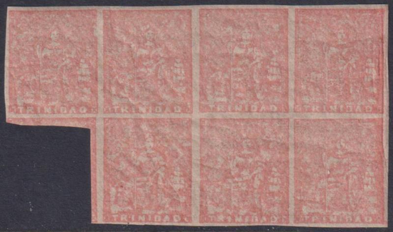 4004 * imageTrinidad 1860 (1d) pale red (shade) irregular block of 7 (horiz block of 6 plus extra at side on top left), 5th issue (poor impressions). Some gum disturbance but MUH. SG 20. Cat £112. (Image)