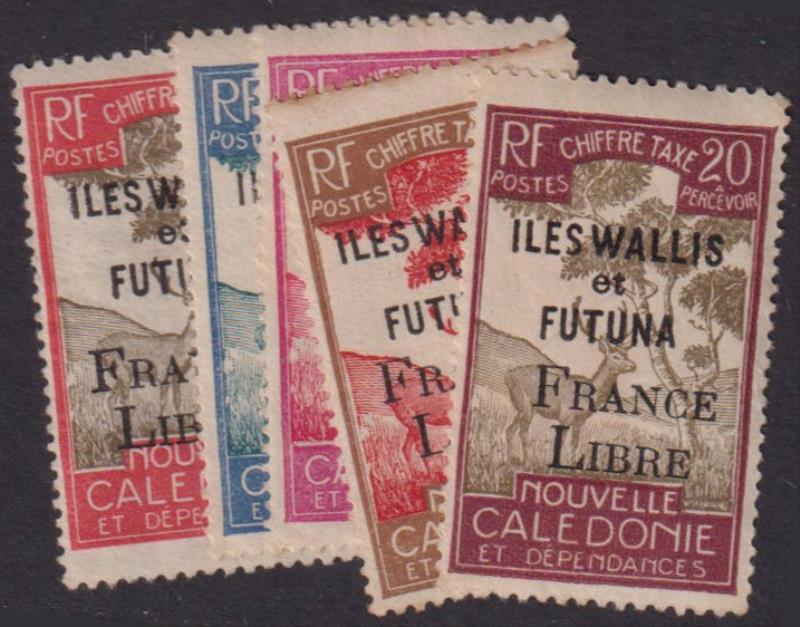 4019 M imageWallis & Futuna Isl 1943 "France Libre" ovpts on 5 diff values of 1930 ovpt Postage Dues (deer): 20c, 50c, 60c, 1F, 2F. Minor faults. SG D131, D134-7. Cat £250. Mint. (Image)