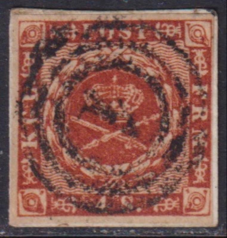 4139 U imageDenmark 1858 4sk brown, imperf, 4 margins. SG 15. Cat £16. FU on piece. (Image)