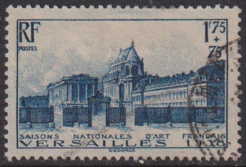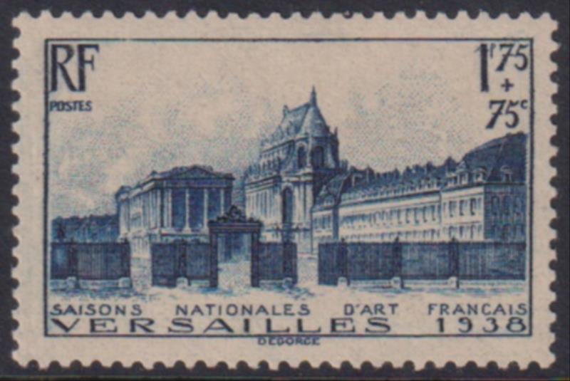 France 1938 1F75 + 75c Music Festivals deep blue (Palais de Versailles). SG 608. Cat £26. FU. (Image)
