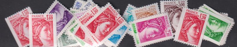 France 1977 1c-5f Sabine defins & incl 8 diff (80c-1f40) coils (40v). SG 2210 etc. Cat £40+. MUH. (Image)