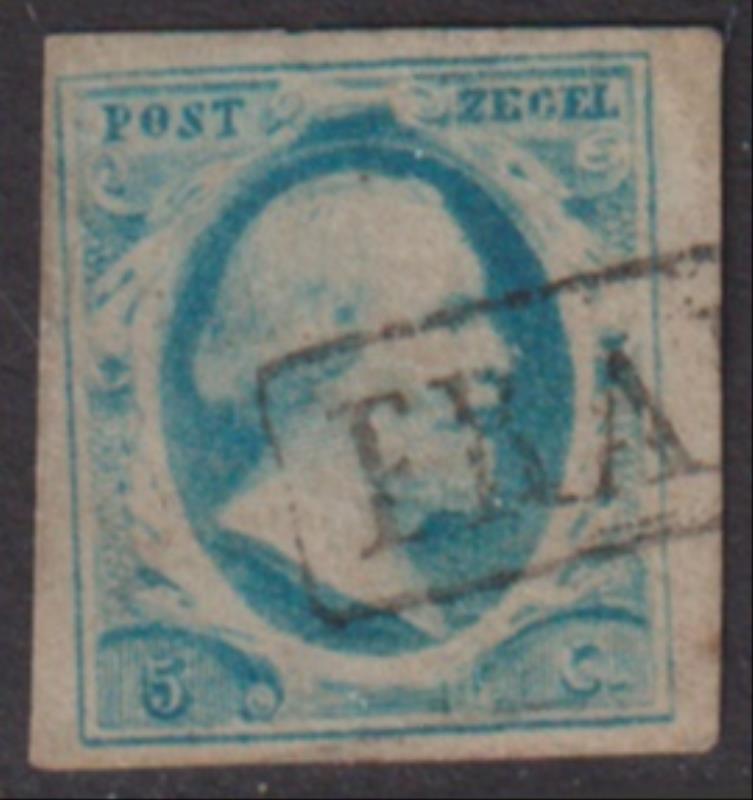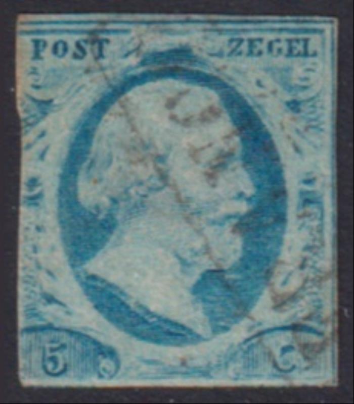 4560 U imageNetherlands 1852 5c William III blue, imperf 3 margins. SG 1. Cat £55. FU. (Image)