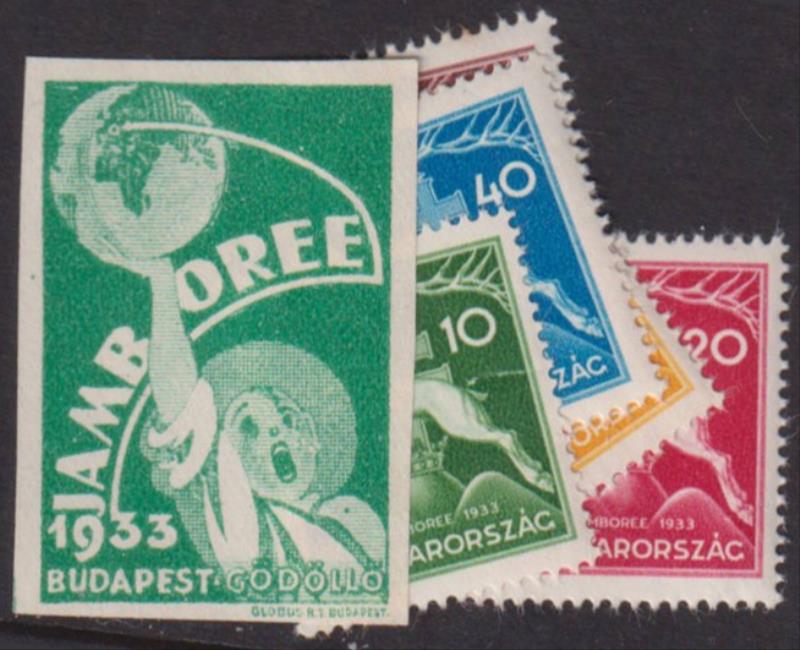 457 M imageScouts: Hungary 1933 Jamboree set (16h perf tone & not counted in cv). Also 1933 Budapest Jamboree green cinderella. SG 563 etc. Cat £35+. Mint. (Image)