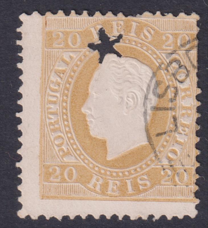 4588 U imagePortugal 1870 20r King Luis, bistre, straight value labels, FU with stag puncture. SG 76. Cat £38. (Image)