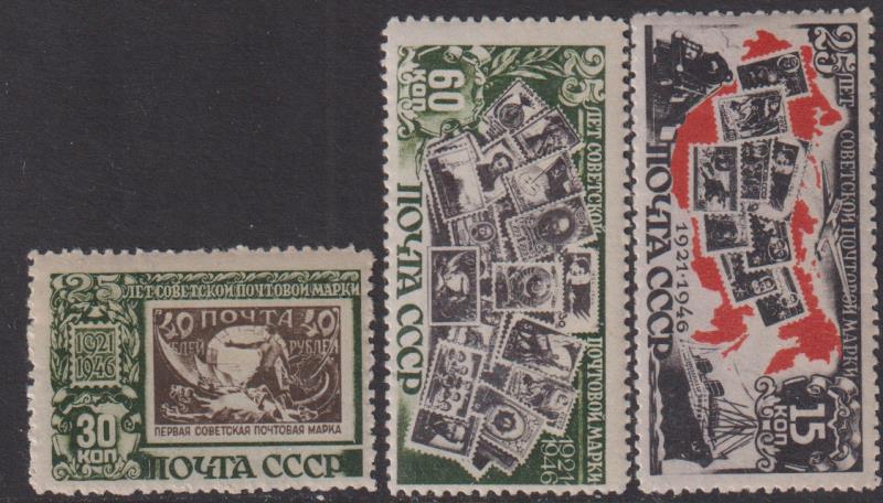 Russia 1946-7 25th Anniversary of Soviet Postal Service set of 3. SG 1220-22. Cat £18. MUH. (Image)