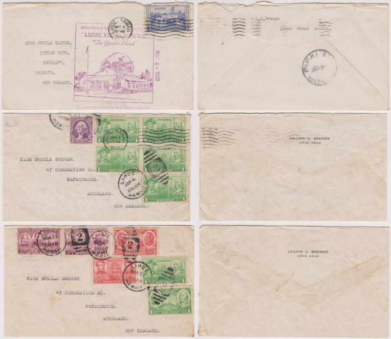 USA-Hawaii 1937-9 covers x 3 to same NZ address ex Lihue (Kauai), incl 2 1937 (somewhat cut down, with multiple stamps) canc