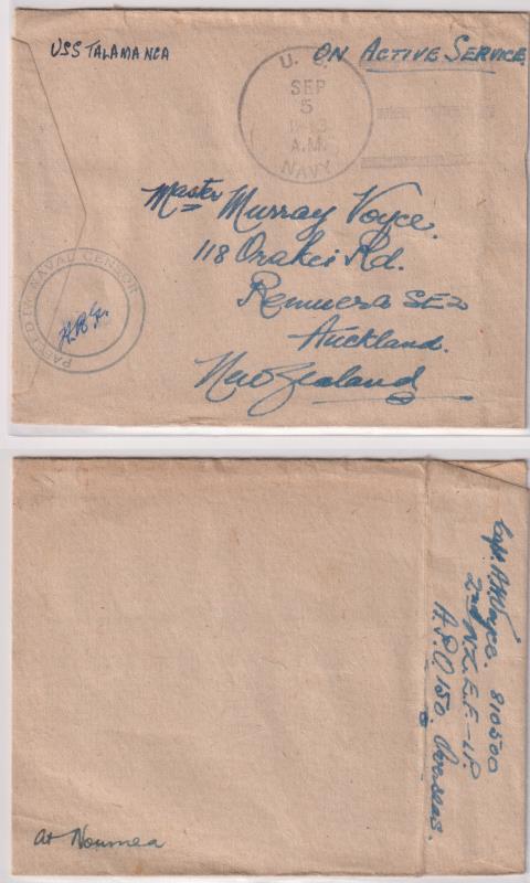 "U.S.S. Talamanca" & "at Noumea". From Captain A.H. Voyce, military chaplain in 2nd NZEF, APO 150, to his son in Auckland, NZ. A po