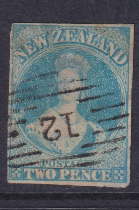 Wanganui (Petre) fine (sharp impression) near complete "12" in bars Perkins Bacon obliterator on FFQ 2d pale blue, no wmk,