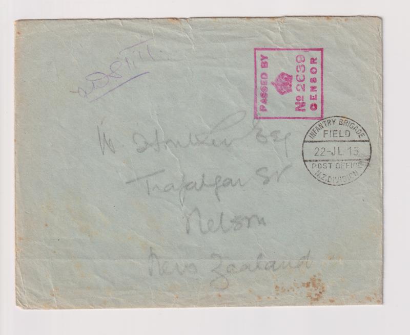 1915 WWI stampless OAS cover canc fine Infantry Brigade N.Z. Division Field P.O. cds 22 JL 15, to NZ, with also fine square